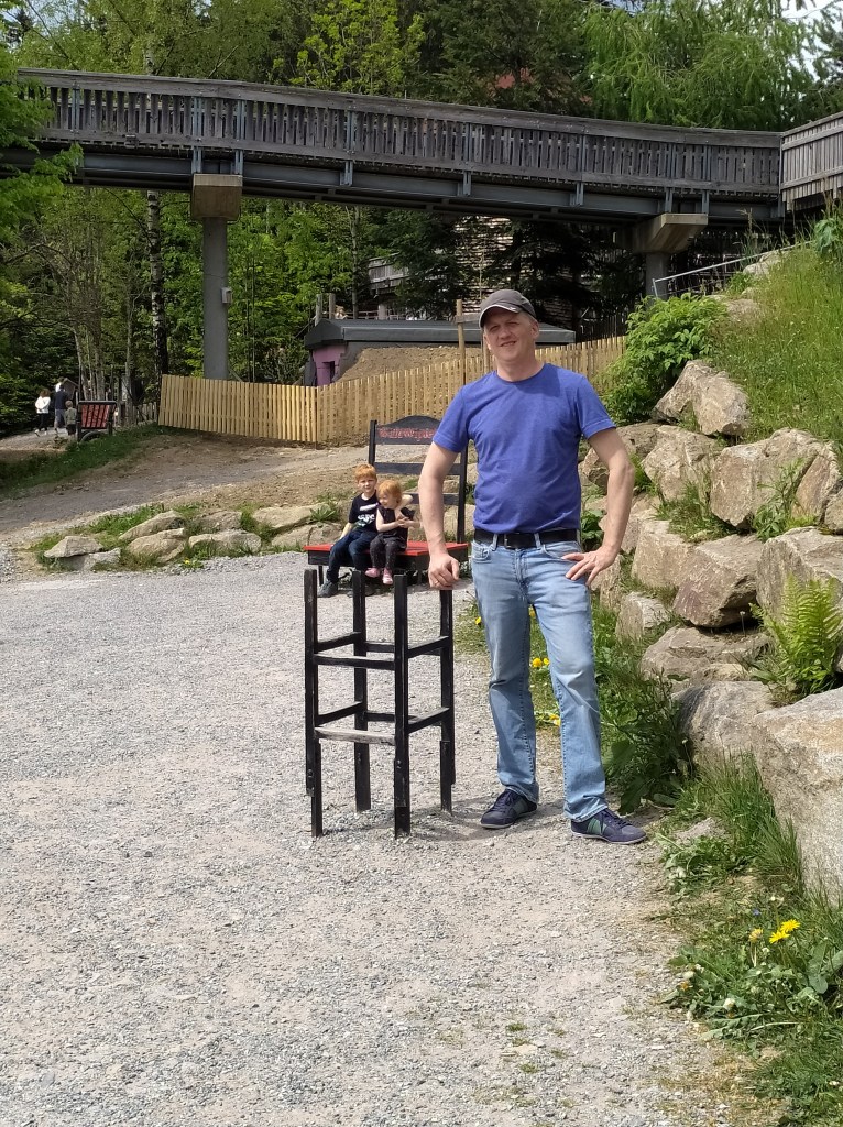 Apropos Foto-Motive. Am Waldwipfelweg gibt es noch weitere tolle Merkwürdigkeiten zu entdecken, die jedem Foto-Betrachter, der nicht live dabei war, ins Grübeln kommen lassen wird. So steht zum Beispiel an exponierter Stelle ein Stuhl, der plötzlich Riesen zu Zwerge werden lässt.